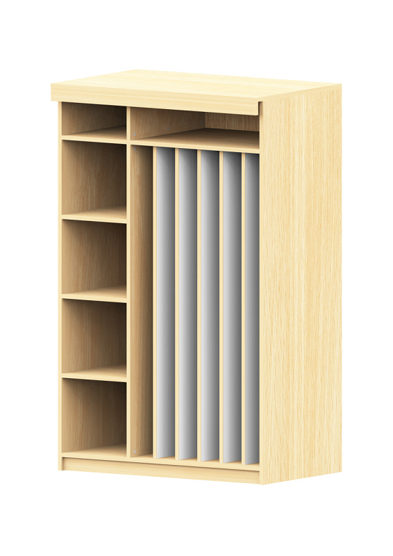 Dieser Liegepolsterschrank besitzt durchgehende Trennwänden (Dekor weiß und ABS-Kante Buche), für Liegepolster mit einer Höhe von 130 bis 140 cm. Die Fächer für das Bettzeug sind oben und seitlich. Er kann mit oder ohne Vorhang bestellt werden.
