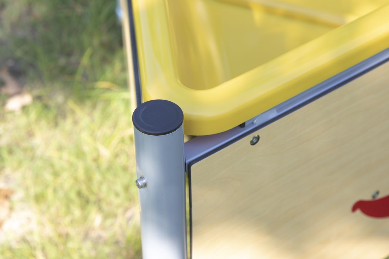 Der mobile Matschtisch besteht aus galvanisiertem, pulverbeschichtetem Stahl und HPL, was ihn besonders stabil und wetterfest macht. Die Matschwanne aus hochwertigem Polypropylen (PP) ist robust und leicht zu reinigen, sodass er auch intensiven Spielphasen problemlos standhält.