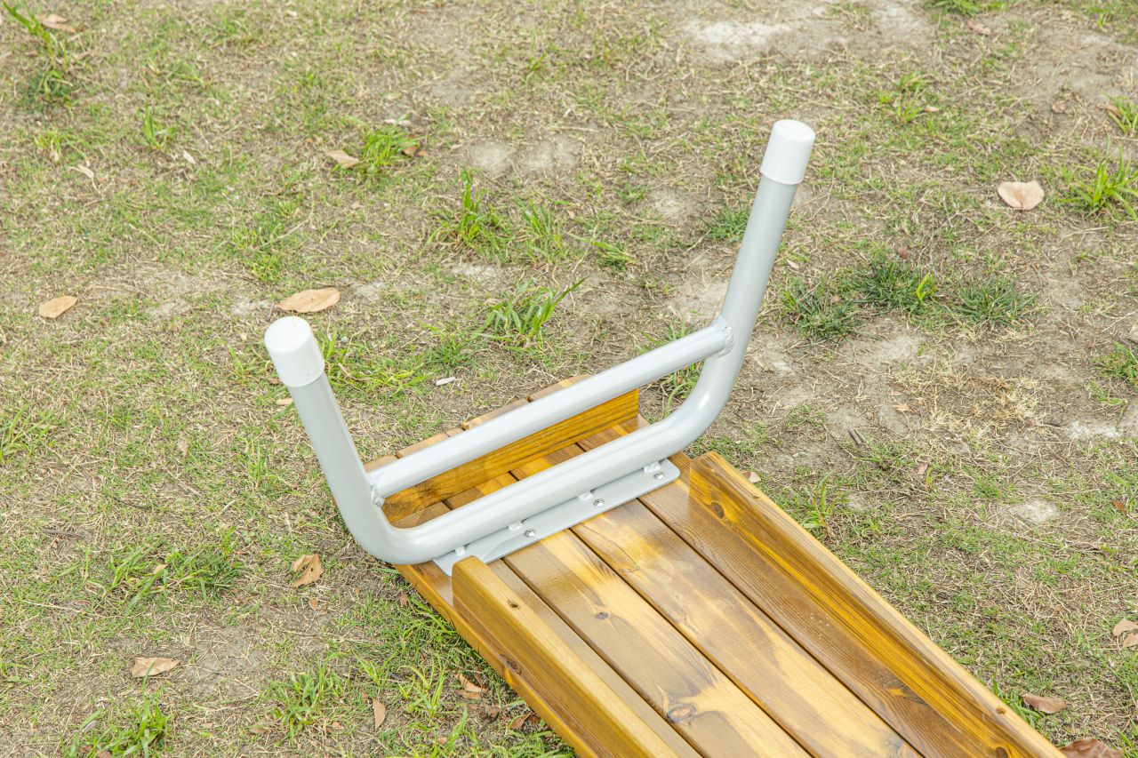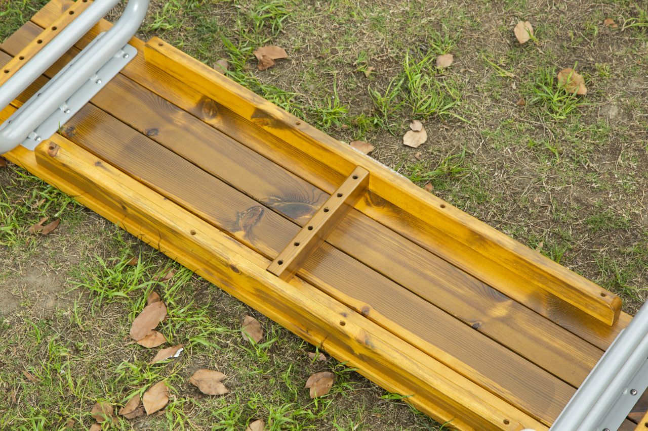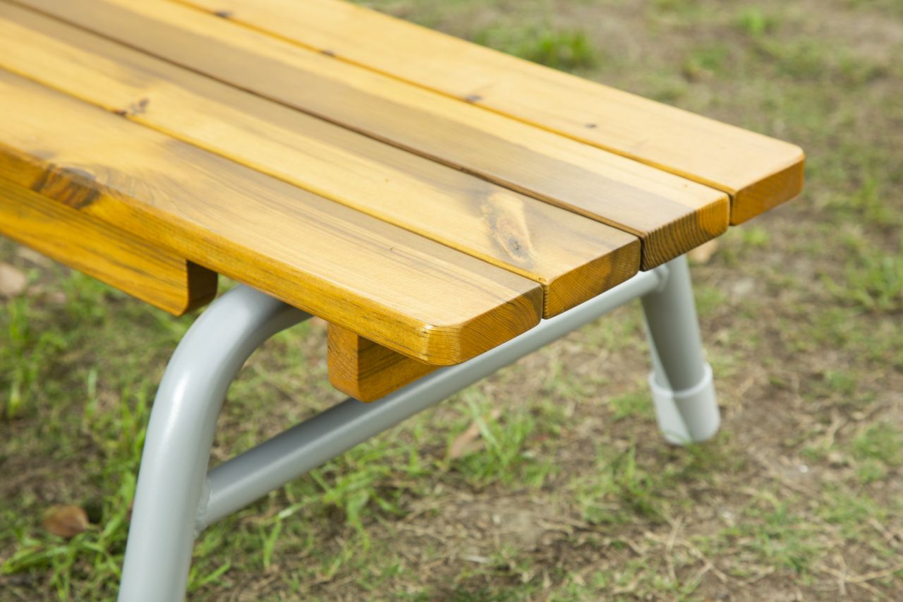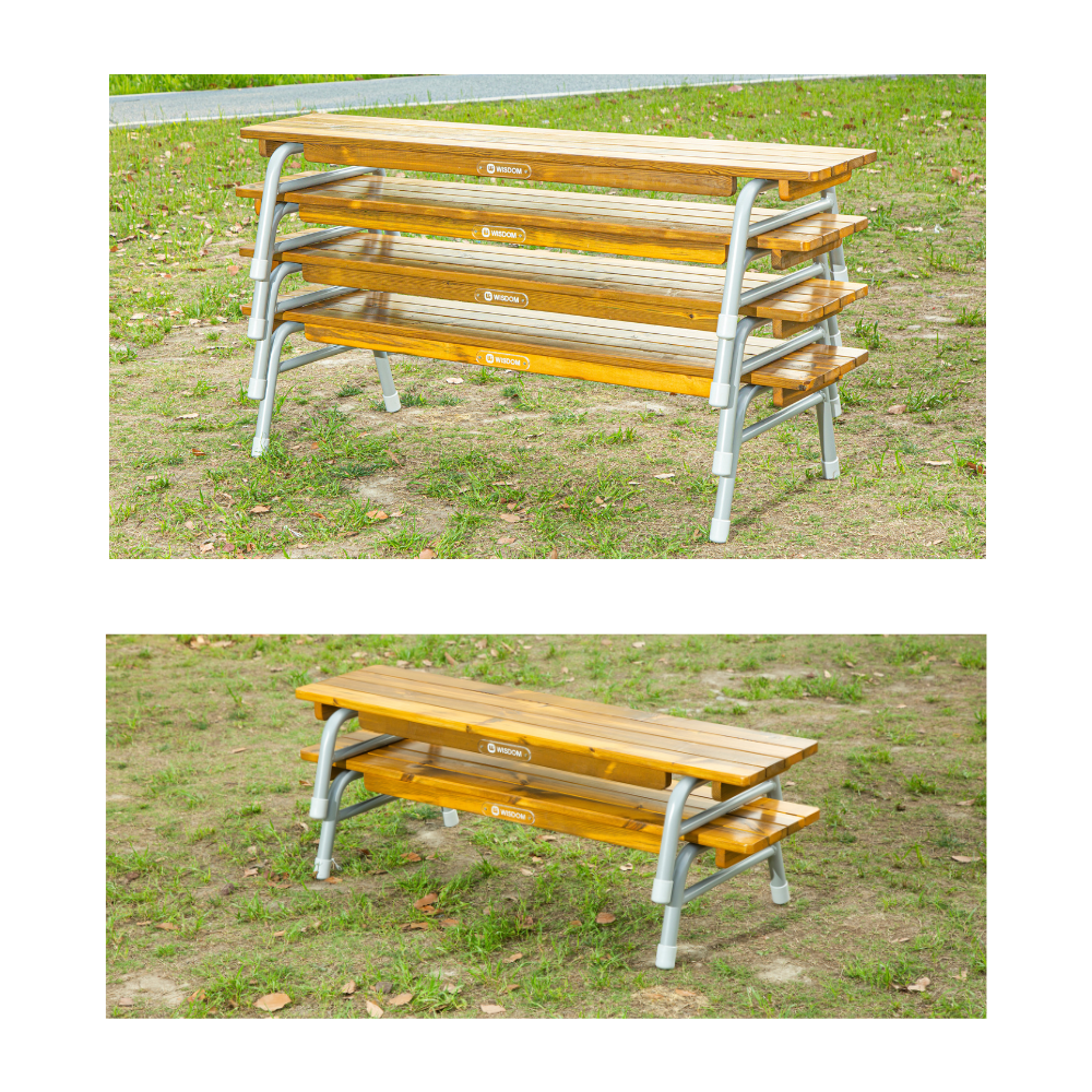 Die Bänke werden aus massivem Holz und die Beine aus stabilem Aluminium gefertigt. Dadurch sind sie stabil und langlebig und zusätzlich noch stapelbar.