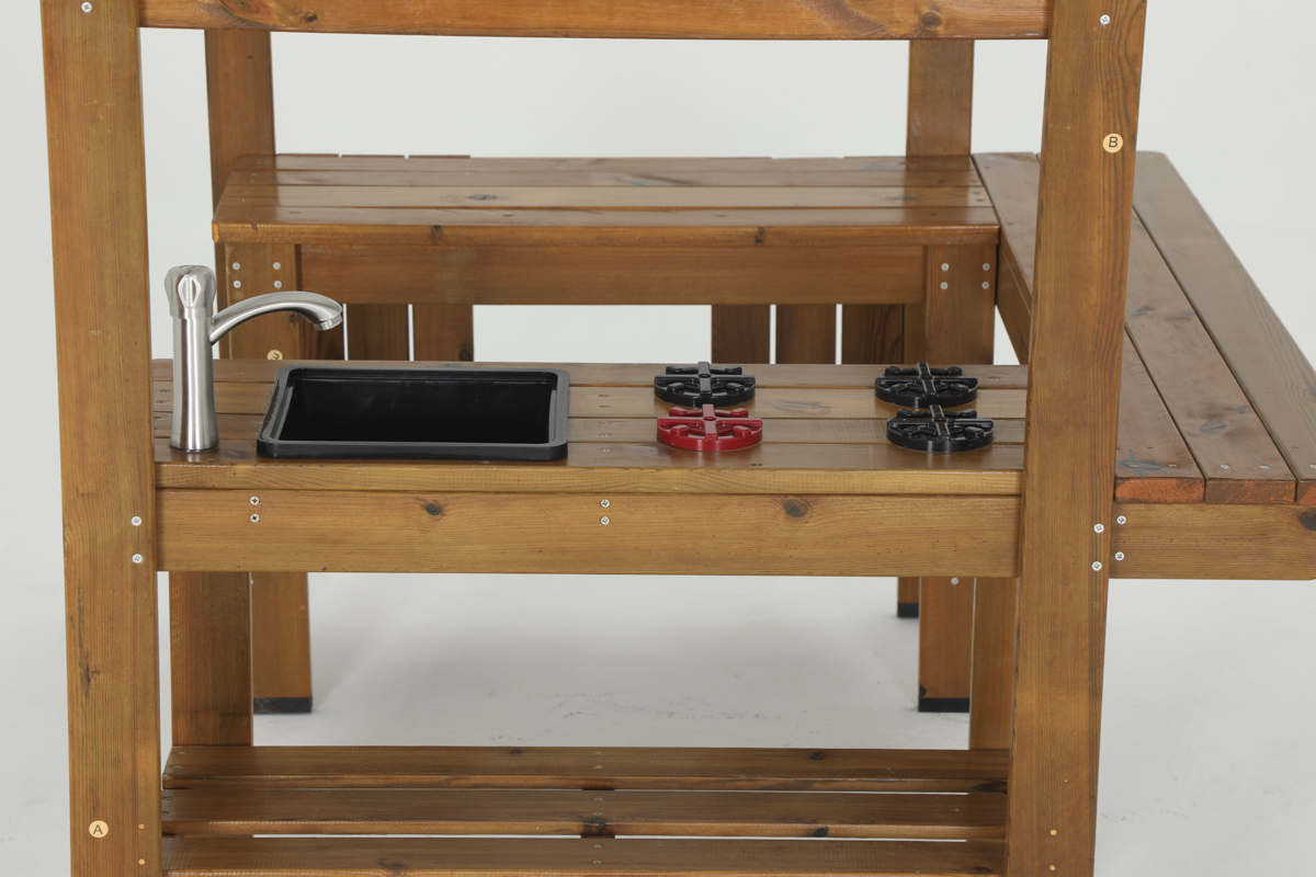 - Interaktive Ausstattung: Mit vier Kochfeldern, einem robusten Kunststoffbecken und einem funktionsfähigen Edelstahl-Wasserhahn.