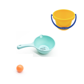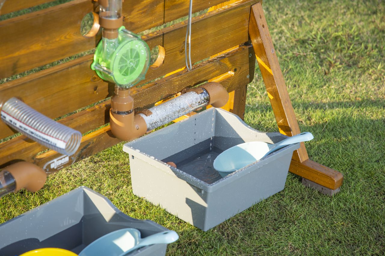 Die 2 grauen Wasser-Auffangbehälter sind in der Lieferung enthalten. Zusätzlich sind 2 Eimer, 2 Schöpfkellen, 1 Schiffchen und 12 Bälle gratis im Set dabei, sodass der Wasserspaß direkt starten kann.