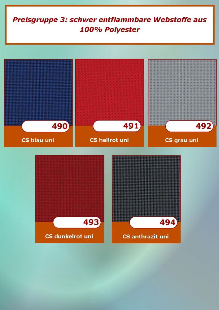 - Preisgruppe 3: schwer entflammbare Webstoffe aus 100% Polyester