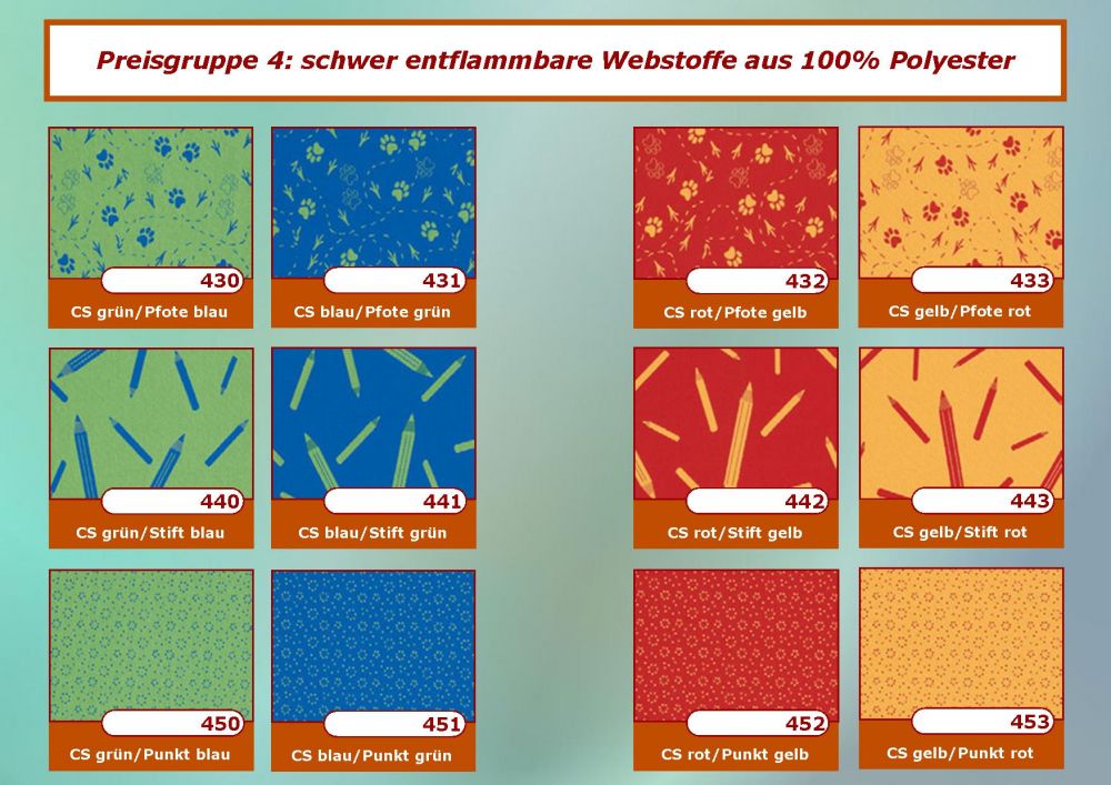 - Preisgruppe 4: schwer entflammbare Webstoffe aus 100% Polyester