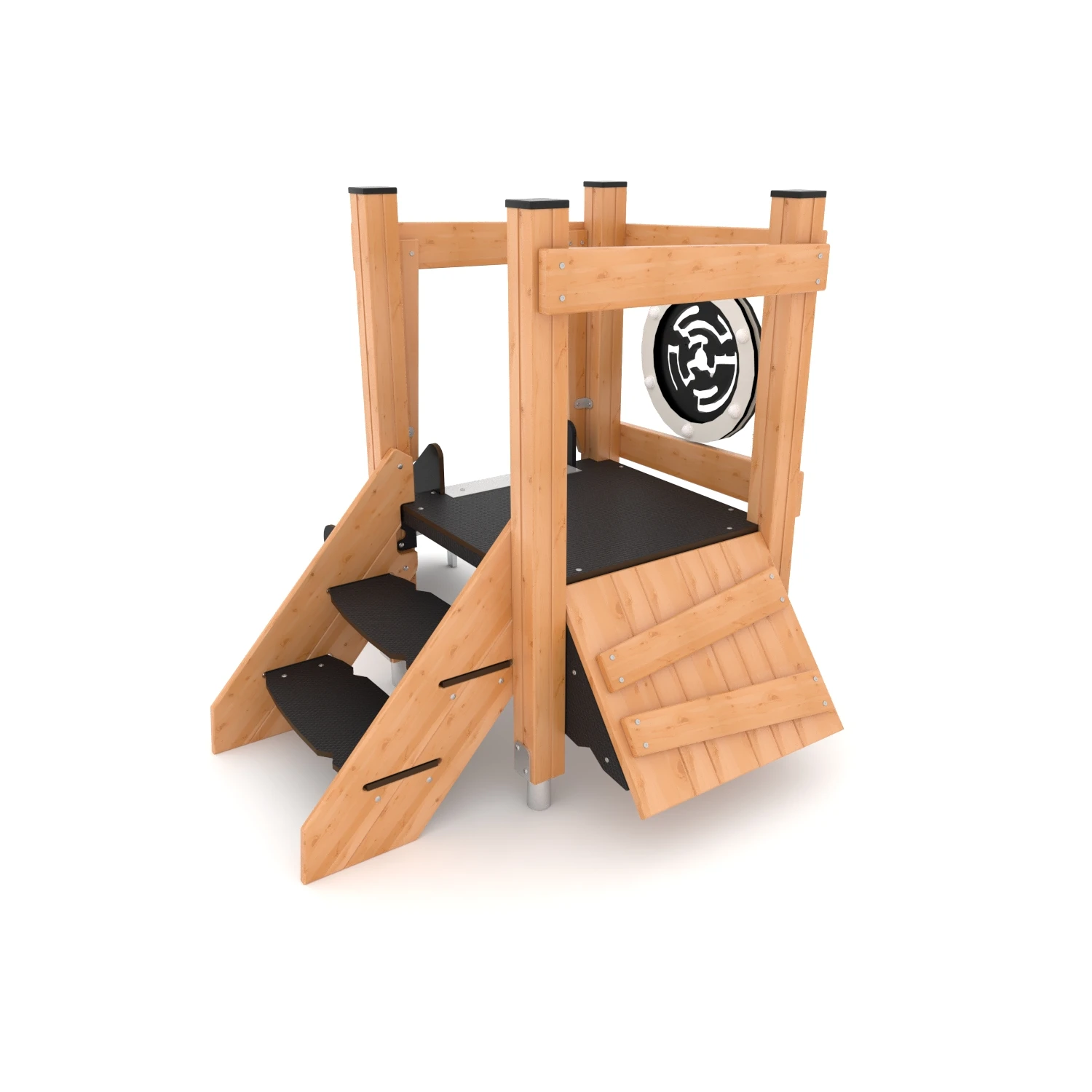- Kletterwände aus hochwertigem, verleimtem, imprägniertem und zweifach lackiertem, astfreiem Kiefernholz mit seitlichen HPL-Platten, witterungsbeständig