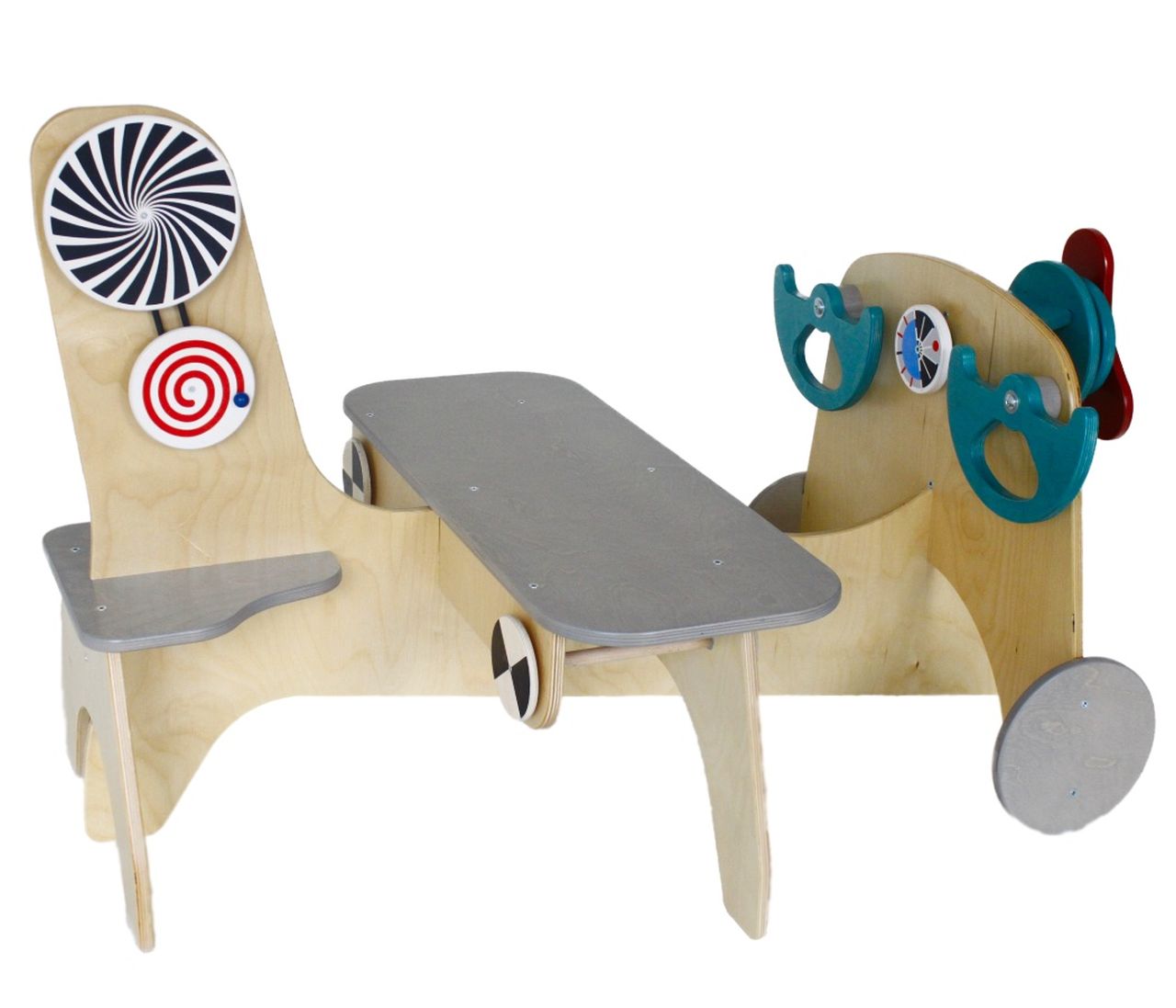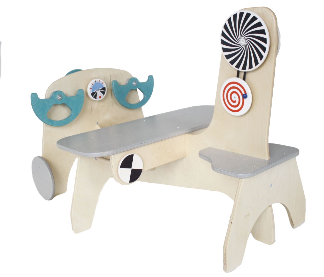 Am Flugzeug gibt es viel zu entdecken. Im Cockpit sind zwei Steuerräder für Pilot und Copilot angebracht. Der Propeller kann durch eine Drehscheibe in Schwung gebracht werden. Am hinteren Teil befinden sich zwei Scheiben, die eine bewegt die andere mit einer Kurbel. Beim Drehen ergeben sich tolle Farbeffekte. Auch die Scheiben unter der Sitzbank sind drehbar.