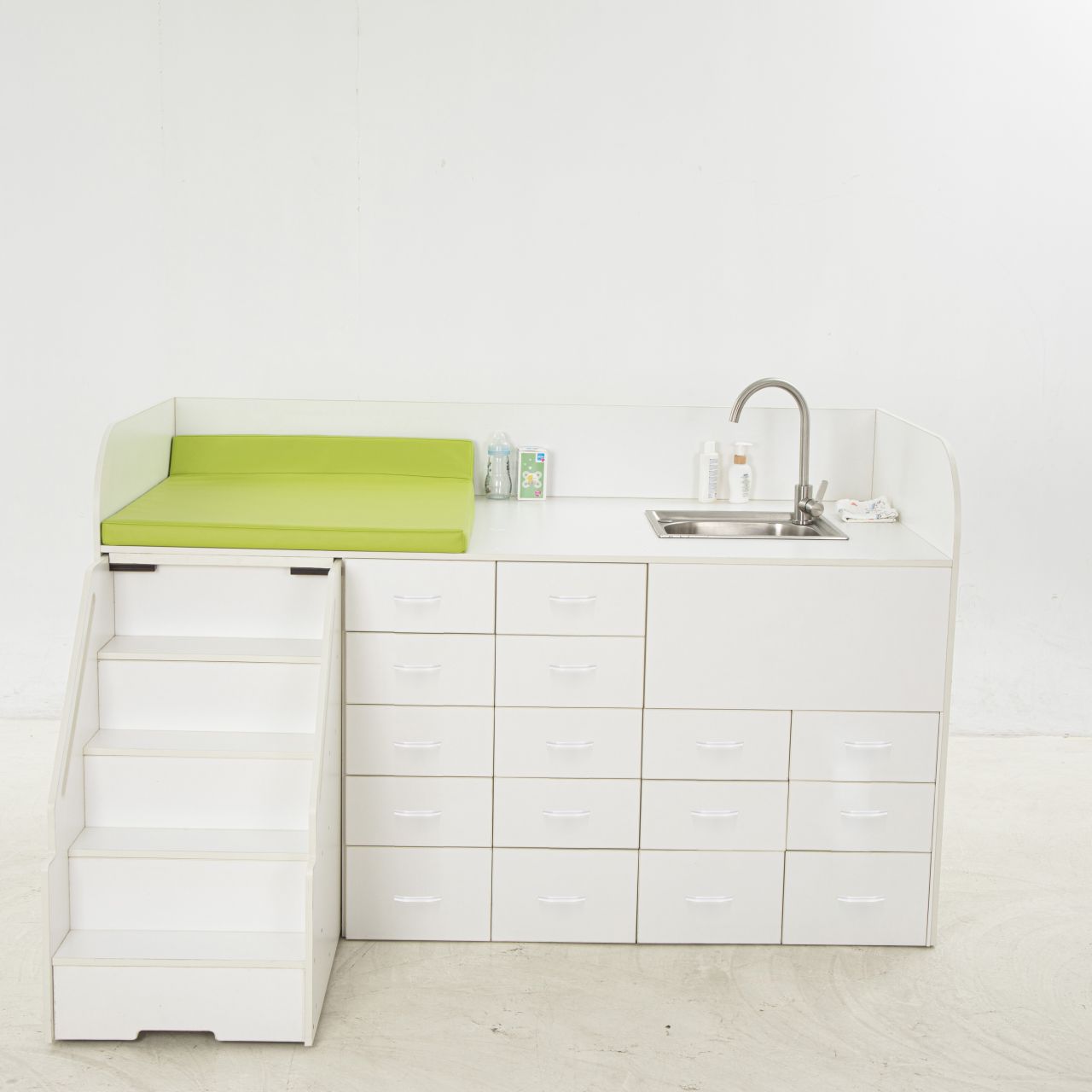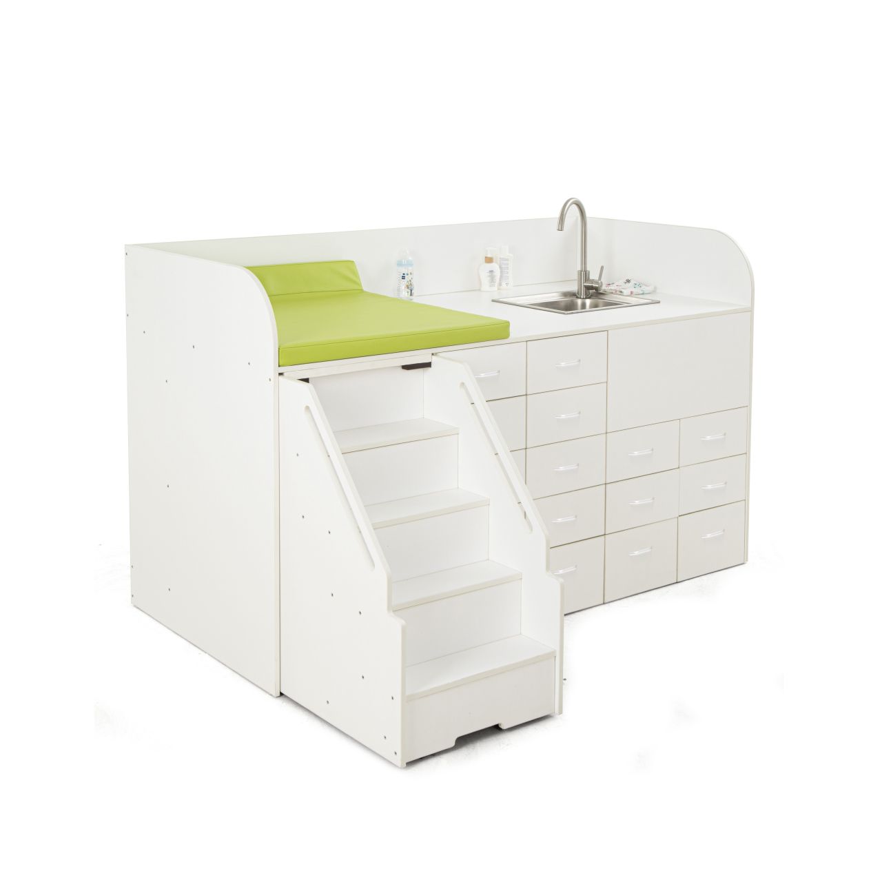 vielseitige Wickelstation mit Treppe, die speziell für den Einsatz in Kindertagesstätten konzipiert wurde. Diese Wickelstation bietet nicht nur eine