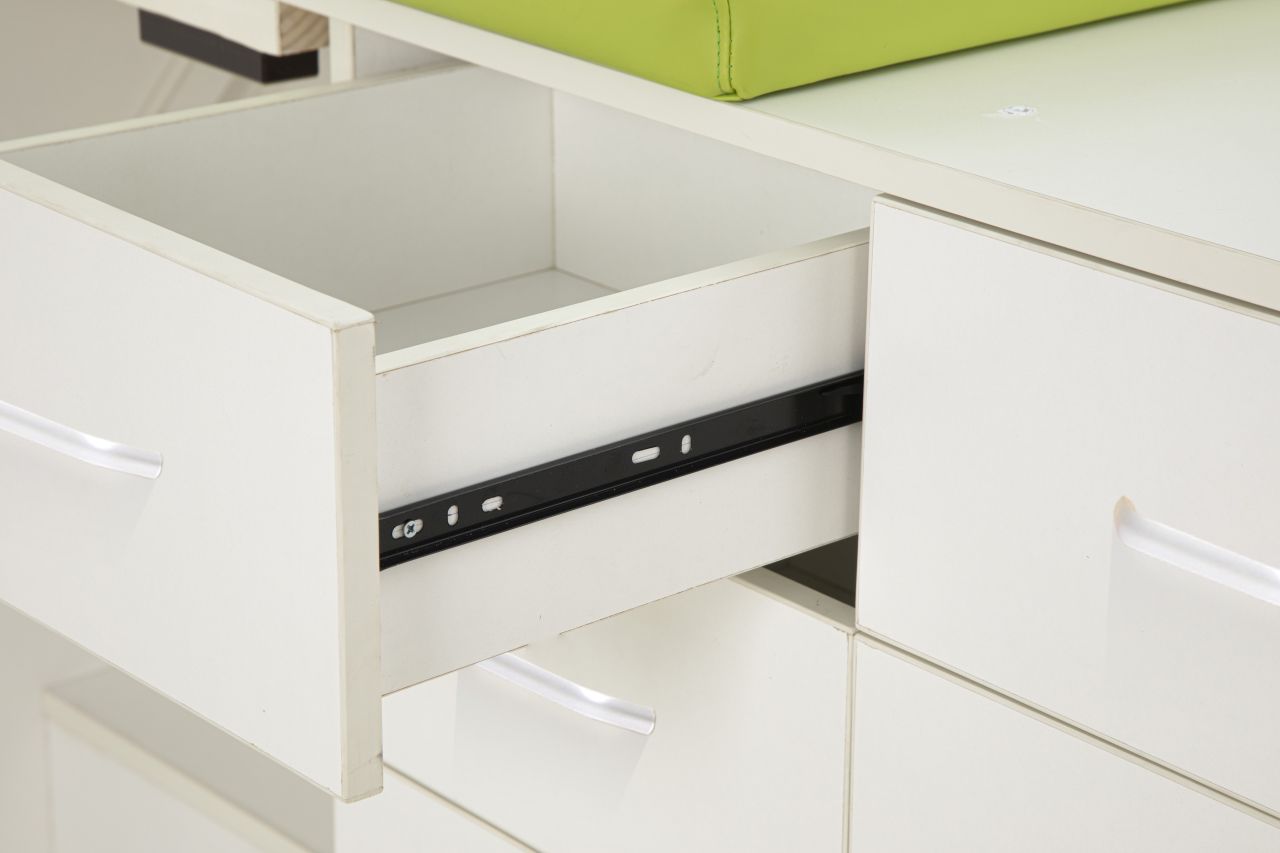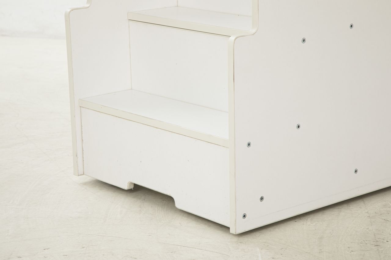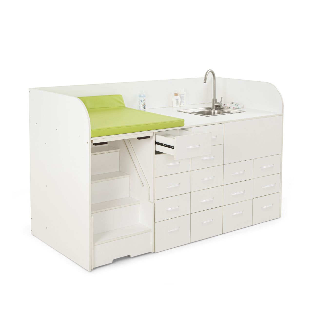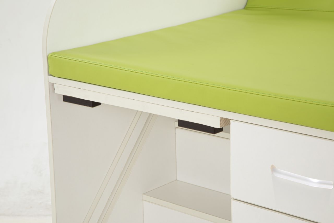 Stauraum mit 16 Schubladen. Die Treppe ist mit einem Seitengeländer ausgestattet, um maximale Sicherheit zu gewährleisten. Bei Nichtgebrauch kann die Treppe platzsparend in der Station verstaut und bei Bedarf einfach herausgezogen werden.